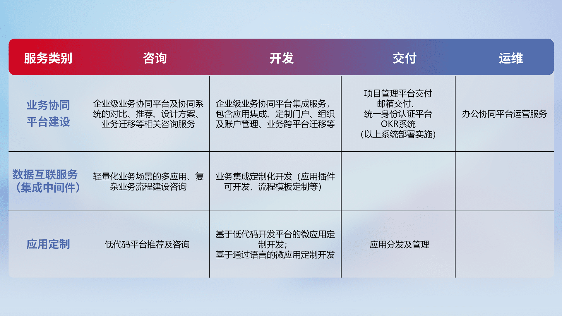 针对钉钉、、、、企微、、IDaas等平台级产品提供产品的规划、、方案、、、交付、、、定制化开发等服务,,实现如统一协同办公、、智能客户服务、、、、混合会议管理、、智能数据查询、、、、等业务场景,,,,实现数字化转型。。