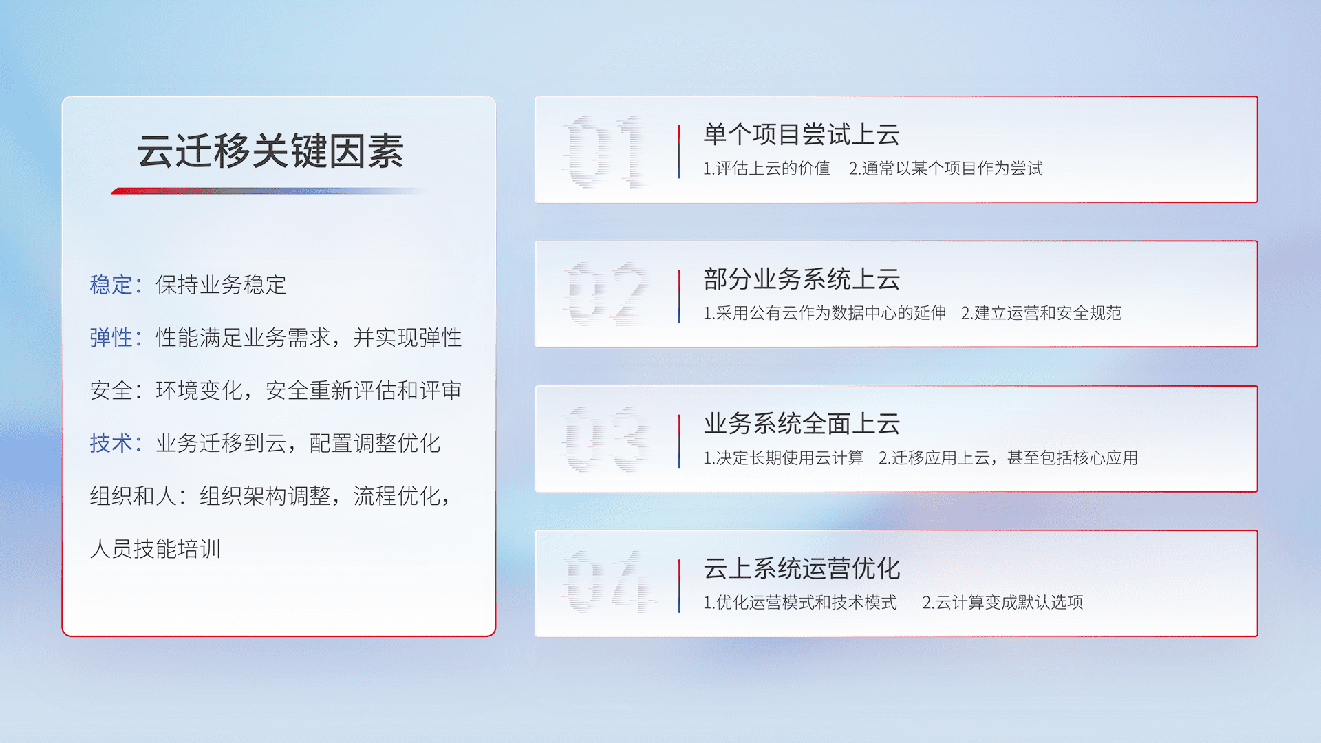 结合实际业务,,,从规划设计、、云平台选型、、、云原生改造、、数据迁移、、集成交付,,迁移全过程为客户识别最佳上云路径,,,,做好风险识别管理,,,,设计网络架构、、、身份权限、、、安全审计合规、、、操作审计、、、、日志审计、、监控告警策略、、多站点容灾设计等,,,,对云上基础设施进行整体规划,,,提升IT治理水平,,以满足弹性、、、、高可用、、高性能的需求。。。。