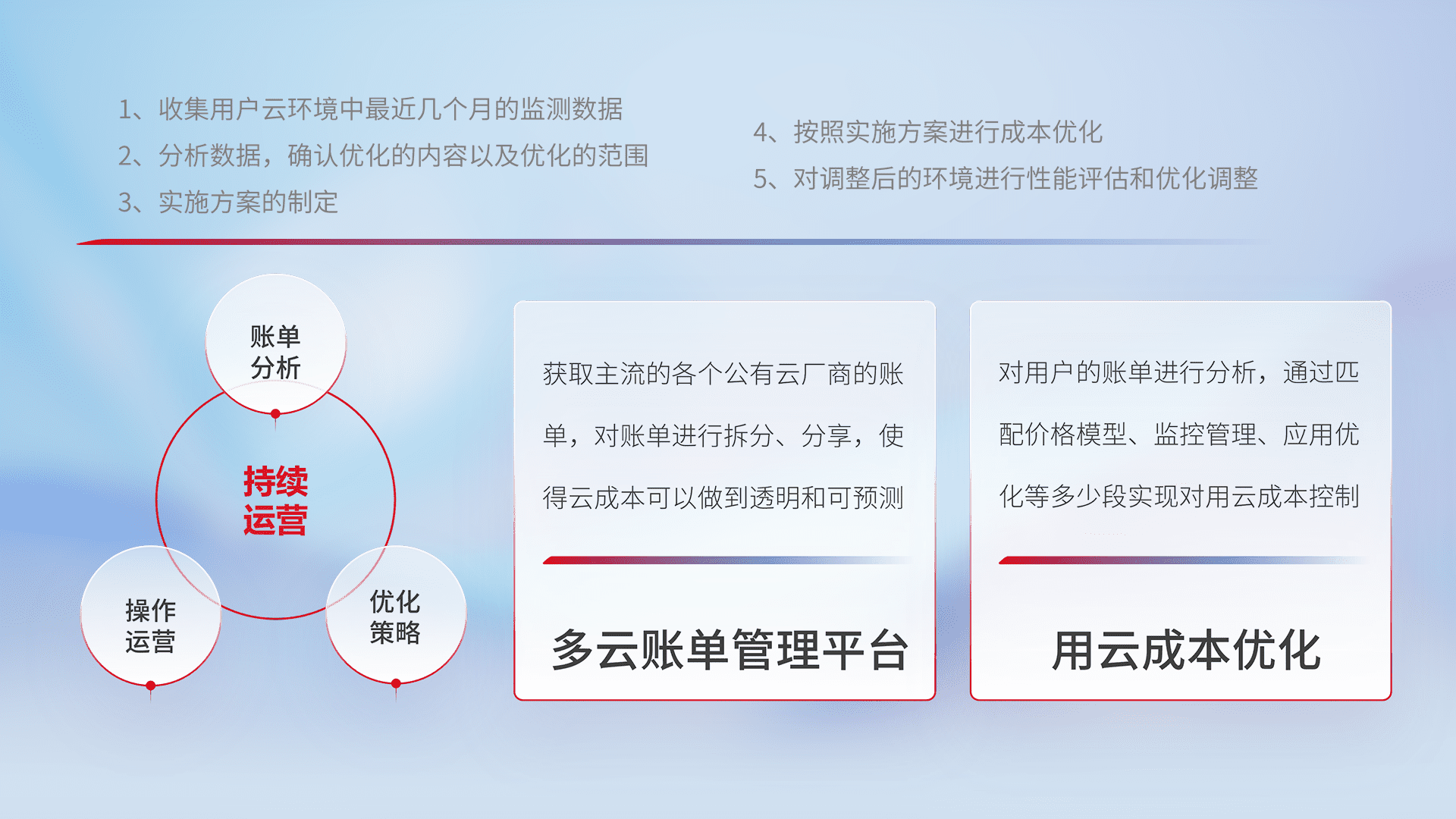通过灵活运用多种自动化迁移工具,,,,帮助企业用户实现业务和数据高效 、、、稳定的上云迁移和云上迁移,,,,采用自研多云纳管平台,,,,以中立管理模式,,,解决多组织、、、多云、、多运维厂商的复杂关系的管理,,保证多云平台资源配置的一致性,,,,实时掌控云资源运行数据,,,,运用智能化工具分析云资源多云平台的管理服务,,,,透明化管理成本支出,,用云成本可预测、、用云费用可优化、、、云资源配额有据可依。。。